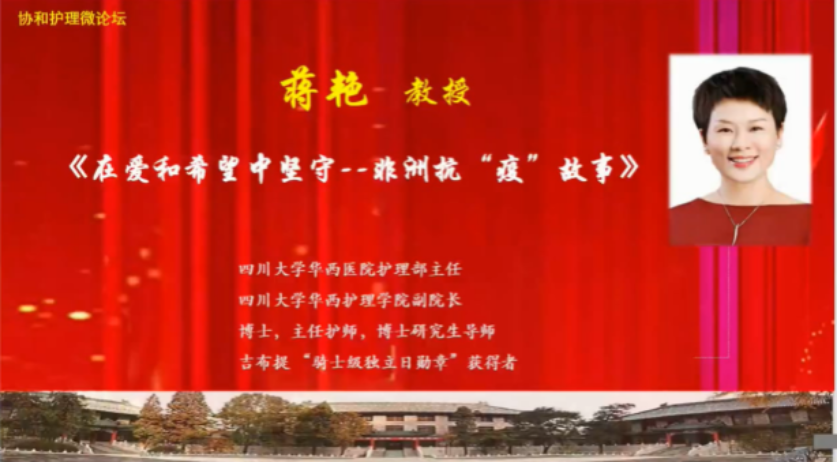 蒋艳教授为华体(中国)一站式服务平台广大师生进行了“在爱和希望中坚守——非洲抗'疫'故事”的讲座,讲述了在新冠疫情下护理人在国际救援中的巨大专业价值和发挥的重要作用。