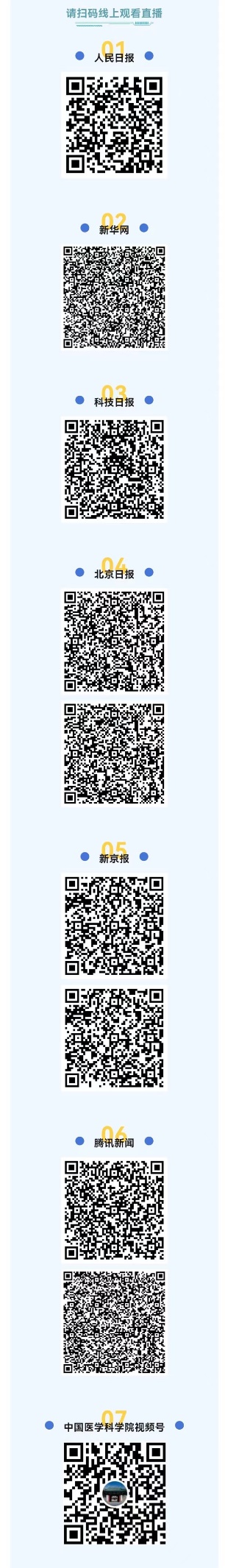 本次大会将通过人民日报客户端、新华网、科技日报、北京日报、新京报、腾讯新闻、中国医学科学院视频号等多家媒体及平台直播。直播间二维码附后。