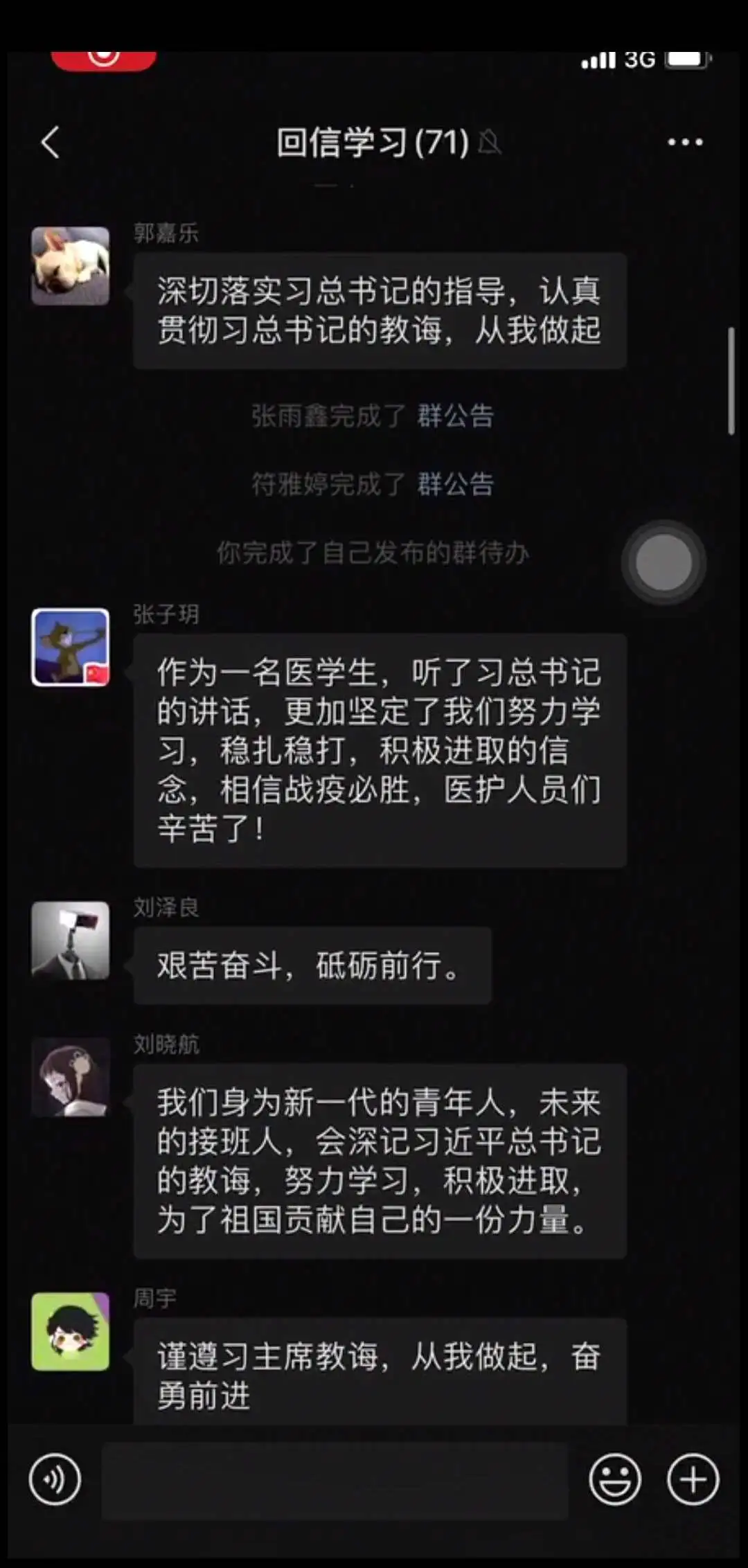 我们感动于援鄂医疗队前辈们的无私奉献,同时习近平总书记的回信中激励的话语也让我受益匪浅。我们一定不辜负习总书记的殷切期盼,不辜负党和国家的希望,主动担当起报效祖国、奉献社会、服务人民的时代责任。我们是新时代的青年人,我们要有理想、有本领、有担当,时刻心中有国家有党有人民。我们要抓住青春的大好时光,努力学习,在将来让青春之花绽放在党和人民最需要的地方。