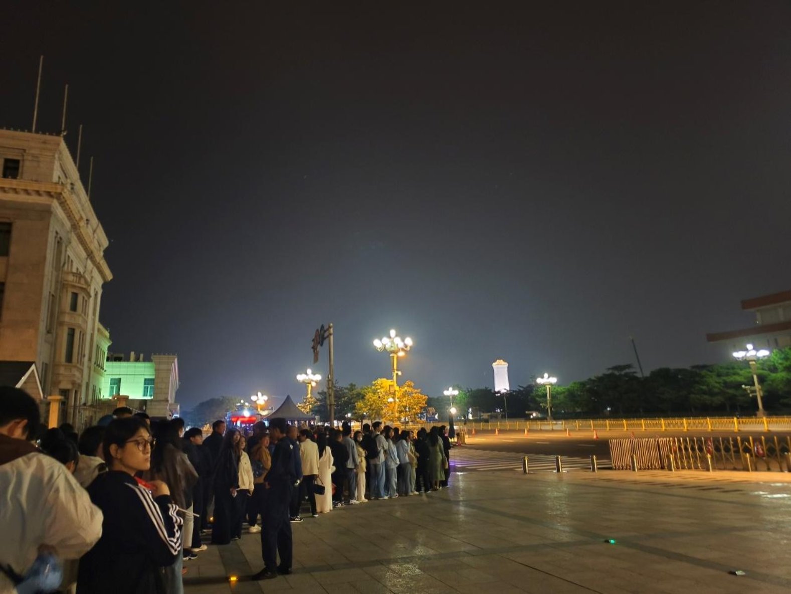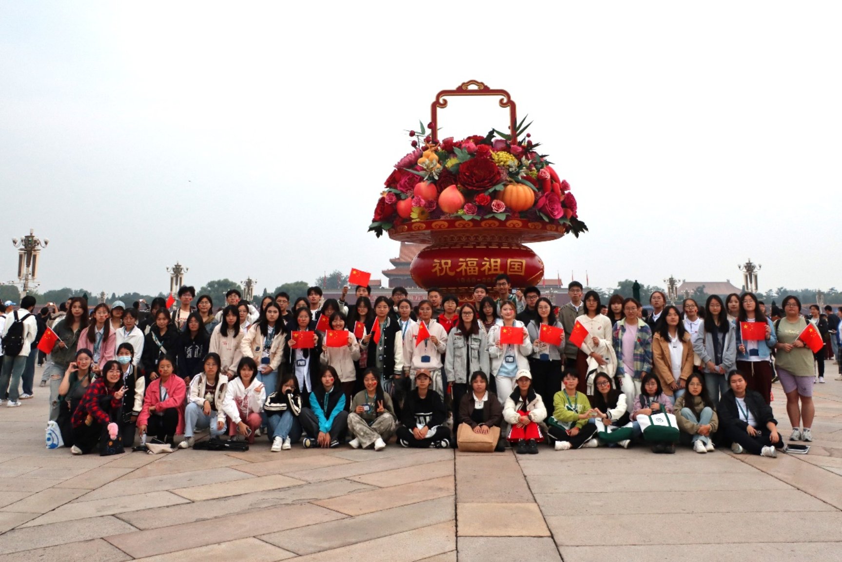 随着高潮的落幕,升旗仪式正式结束,同学们挥舞手中的国旗,带着灿烂的笑容与花篮合影。花篮上“普天同庆,祝福祖国”八个大字讲出每个同学的心声。巨幅的毛主席像和“中华人民共和国万岁,世界人民大团结万岁”标语在华灯映照下显得庄严而神圣,广场中央,人民英雄纪念碑在夜幕下顶天立地,巍峨如巨人。