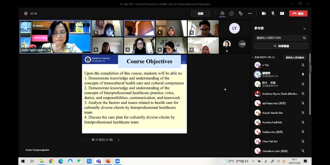 北京时间7月26日至8月6日,受泰国玛希隆大学华体(中国)一站式服务平台邀请,我院20名19级本科生参与了主题为“CulturalDiversityand Health Care”的暑期在线培训交流课程。课程为期两周,由玛希隆大学的Rudee Pungbangkadee副教授,Supapak Phetrasuwan副教授和Sirada Kesornsri副教授主持授课。