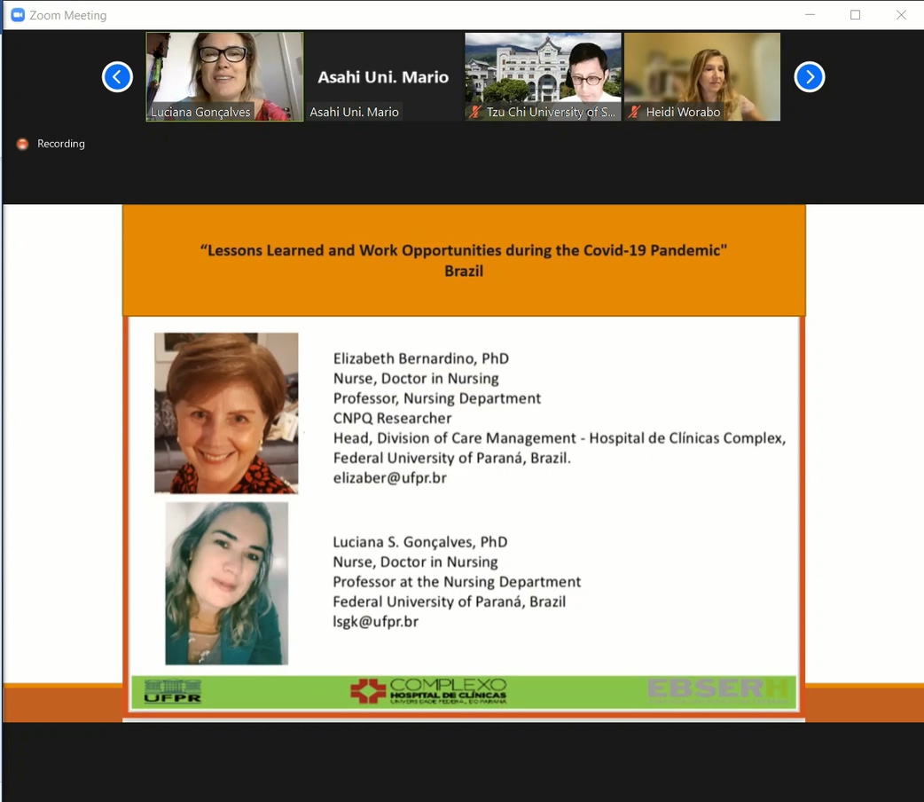 会议邀请了多位护理专业的教育工作者和学者,包括世界卫生组织东南亚地区护理技术官员AiTanimizu,泰国清迈大学的Wanchai Lertwatthanawilat教授,巴西巴拉纳联邦大学的LucianaS.Goncalves教授,哥伦比亚国立大学的DanielArturoGuerrero,土耳其健康科学大学的ElifDONMEZ教授,美国德克萨斯大学圣安东尼奥健康科学中心的HeidiJ.Worabo教授分别分享了各自国家和地区在新冠肺炎期间护理教育受到的影响和冲击,以及应对的经验和方法。与会学生普遍表示通过本次交流活动,提升了口语交流能力,开拓了国际视野,增加了对新冠疫情对国际上护理教育影响的认知。