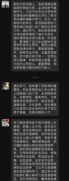 学习过程中,大家积极交流感想,深刻感受到习近平总书记对新一代青年的关心关爱,决心按照习近平总书记的指示精神和思政课程要求,发挥积极性、主动性和创造性,以更加奋发昂扬的精神面貌去迎接新时代的挑战。
