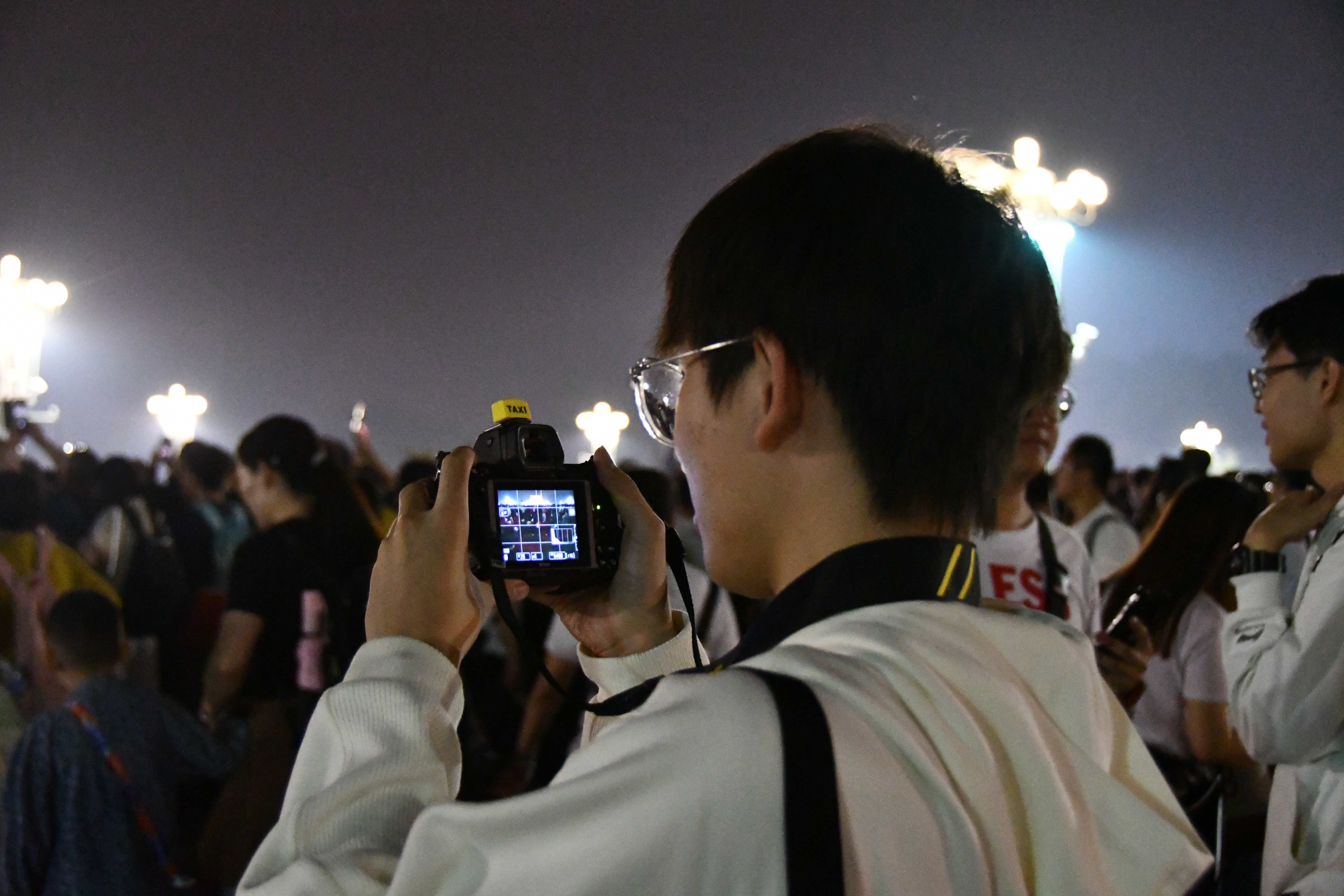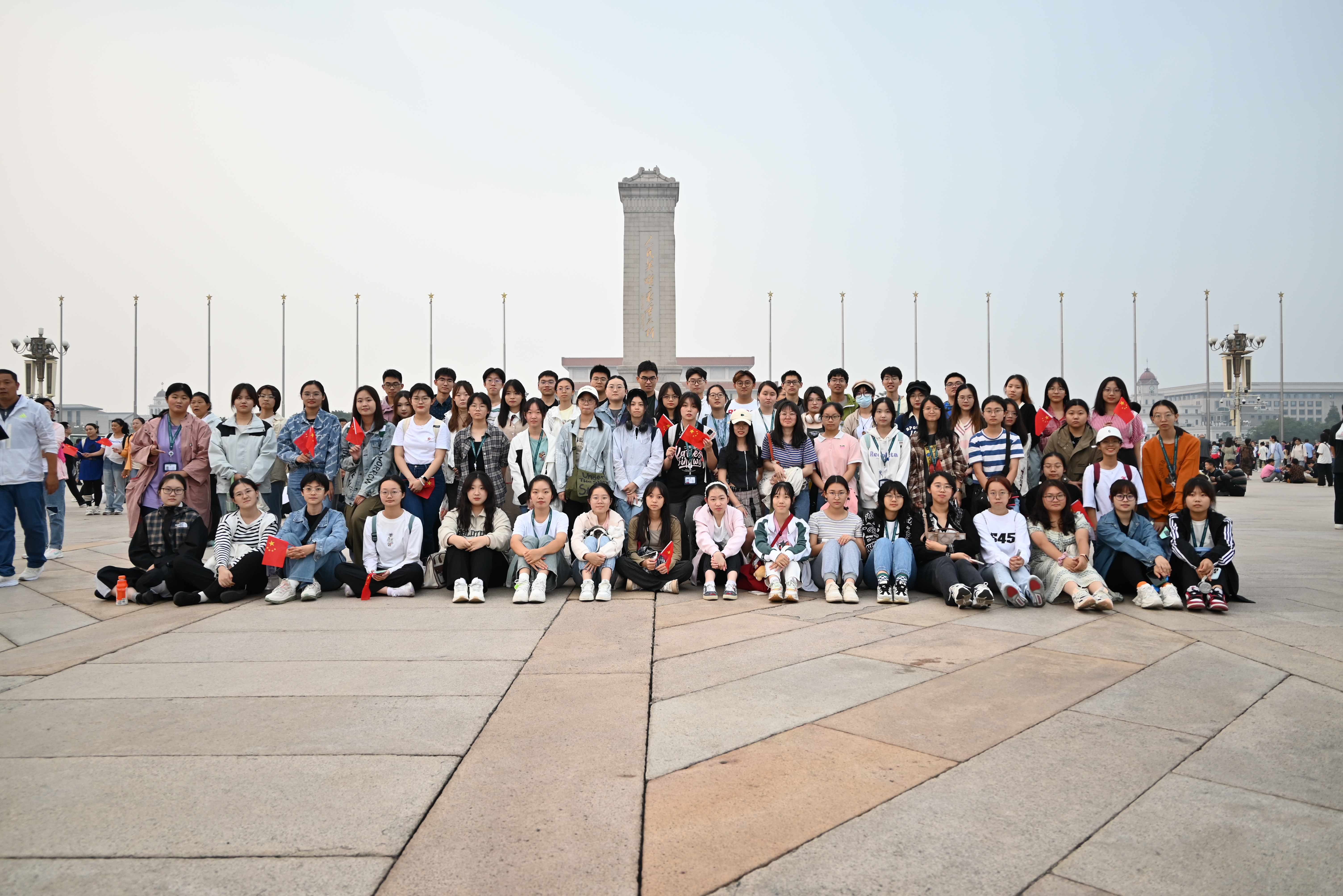 凌晨一时,全体同学于校门口集合乘大巴前往天安门广场。日出时分天光渐亮,升旗仪式正式开始。仪仗队自对侧齐步迈进,横跨长安街移步升旗台,朝霞映衬下,队员们神采奕奕,英姿飒爽。5点57分,军乐队奏响《义勇军进行曲》,全场不约而同激扬齐唱,歌声遍彻广场,伴随着擎旗手有力地抛旗,国旗缓缓升起。“敬礼——”,同学们面向国旗行注目礼,以最昂扬的姿态向国旗致敬。升旗结束,同学们在人民英雄纪念碑前集体合影留念。
