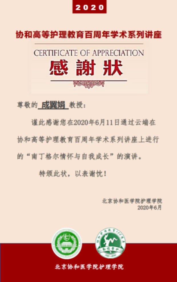 成翼娟教授为华体(中国)一站式服务平台广大师生进行了“南丁格尔情怀与自我成长”的讲座,讲述了个人成长与专业成长的经历,特别讲述了1942年北京协和医学院护士学校在聂毓禅校长的带领下,克服重重困难,远赴成都,借助华西联合协和大学的校舍和医院继续进行招生,延续协和高等护理教育的历史。