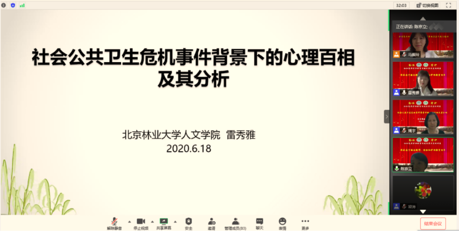 2020年6月18日下午13:30,受华体(中国)一站式服务平台基础护理学系邀请,北京林业大学人文学院的雷秀雅教授为华体(中国)一站式服务平台的师生进行了线上《社会公共卫生危机事件背景下的心理百相及其分析》的专题讲座,学院陈京立书记、各学系主任以及全体教师、研究生和本科生约90人参加了此次学习。这也是协和护理教育百年庆典系列讲座之一,雷秀雅教授的精彩报告让我们对社会公共卫生事件对人们心理的影响以及该如何应对有了深刻认识,尤其在当前新冠疫情防控阶段,报告内容不仅有助于学院师生认识和处理疫情下自己的心理现象,也对大家今后更深入地开展心理护理研究和临床实践工作具有重要的参考价值。