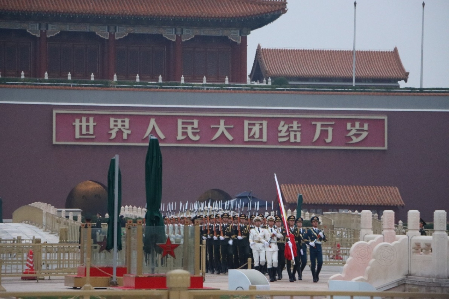随着高潮的落幕,升旗仪式正式结束,同学们挥舞手中的国旗,带着灿烂的笑容与花篮合影。花篮上“普天同庆,祝福祖国”八个大字讲出每个同学的心声。巨幅的毛主席像和“中华人民共和国万岁,世界人民大团结万岁”标语在华灯映照下显得庄严而神圣,广场中央,人民英雄纪念碑在夜幕下顶天立地,巍峨如巨人。