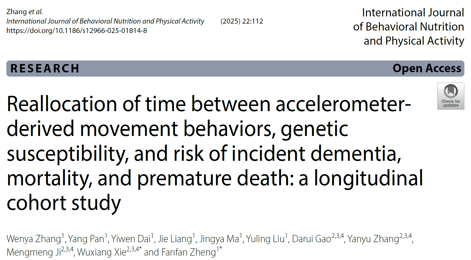 华体平台郑凡凡研究员团队在行为营养学顶刊International Journal of Behavioral Nutrition and Physical Activity(中科院一区Top)上发表了题为《Reallocation of time between accelerometer-derived movement behaviors, genetic susceptibility, and risk of incident dementia, mortality, and premature death: a longitudinal cohort study》的研究论文(DOI: 10.1186/s12966-025-01814-8),首次探讨了24小时内重新分配不同形式的运动行为(包括中重度体力活动、轻度体力活动、静坐和睡眠)与新发痴呆、死亡及过早死亡风险的关联,评估了遗传易感性的潜在交互作用。