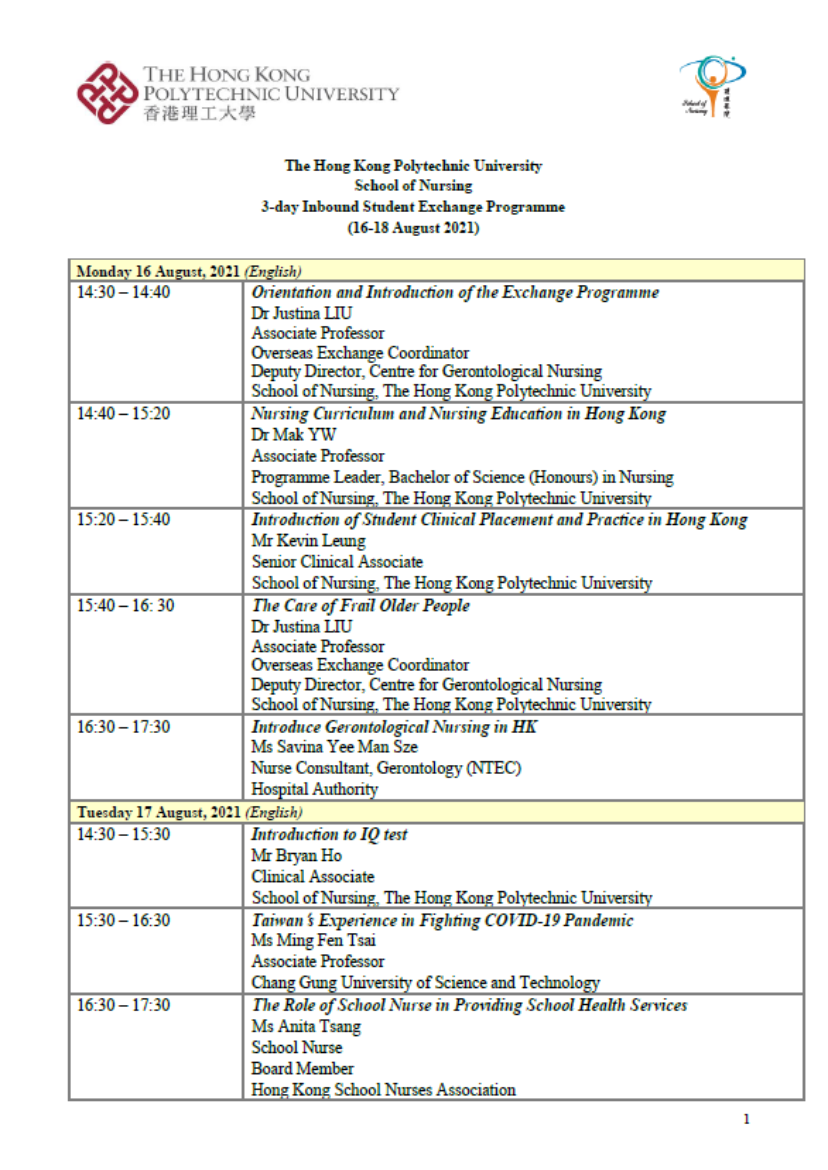 北京时间8月16日至8月18日,我院10名19级本科生参与了由香港理工大学华体(中国)一站式服务平台举办的内地学生交流项目。项目旨在分享香港理工大学护理专业课程培养及学生实习经验,共同交流和学习护理专业知识及不同地区的临床护理发展现状。由香港理工大学牵头,多所国内外知名护理院所参加了本次授课,包括长庚科技大学,香港学校护士学会,乐卓博大学,查尔斯达尔文大学护理与助产学院,新加坡国立大学护理研究中心,四川大学华西华体(中国)一站式服务平台,中山大学华体(中国)一站式服务平台,江南大学附属医院,扬州大学,浙江大学城市学院医学院等等。