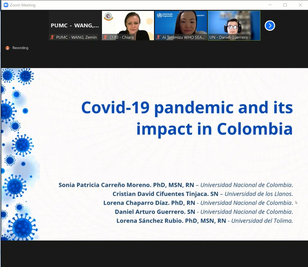 会议邀请了多位护理专业的教育工作者和学者,包括世界卫生组织东南亚地区护理技术官员AiTanimizu,泰国清迈大学的Wanchai Lertwatthanawilat教授,巴西巴拉纳联邦大学的LucianaS.Goncalves教授,哥伦比亚国立大学的DanielArturoGuerrero,土耳其健康科学大学的ElifDONMEZ教授,美国德克萨斯大学圣安东尼奥健康科学中心的HeidiJ.Worabo教授分别分享了各自国家和地区在新冠肺炎期间护理教育受到的影响和冲击,以及应对的经验和方法。与会学生普遍表示通过本次交流活动,提升了口语交流能力,开拓了国际视野,增加了对新冠疫情对国际上护理教育影响的认知。