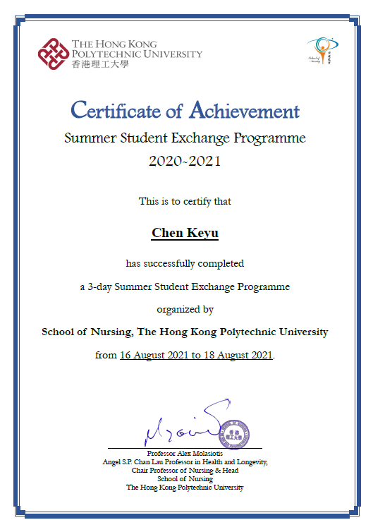 学生通过在线视频授课的方式,锻炼了英文口语交流能力,学习国内外先进护理学科发展经验,开拓了国际视野,对本次国际交流活动给予了极高的好评。同时,与会同学参与课程后收到了由香港理工大学华体(中国)一站式服务平台颁发的参与证书。